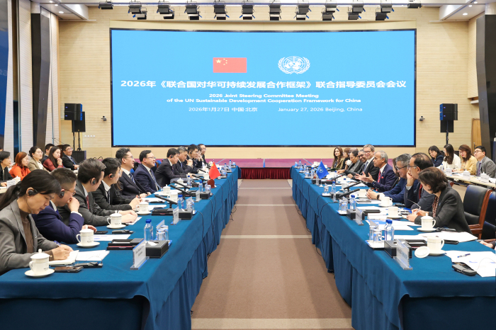 1月27日,2026年《联合国对华可持续发展合作框架》联合指导委员会会议在京召开。商务部国际贸易谈判副代表蒋成华与联合国驻华协调员常启德共同主持会议。联合国驻华协调员办公室、开发计划署、儿童基金会、人口基金、工发组织等18家联合国驻华机构,以及外交部、国家发展改革委等21家中方单位代表参会。