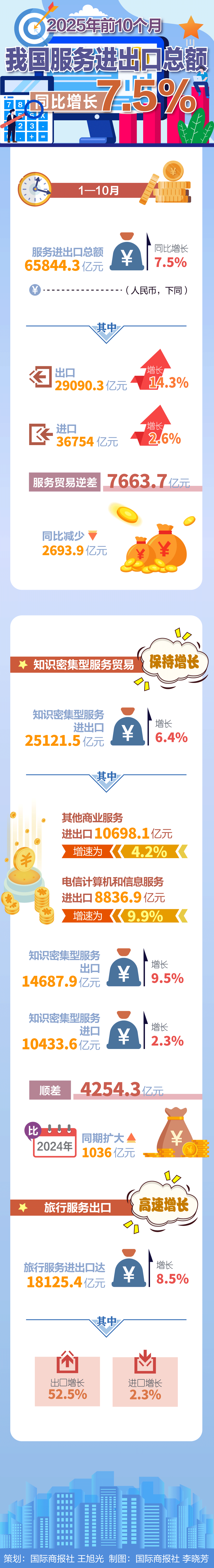 2025年前10个月 我国服务进出口总额同比增长7.5%
