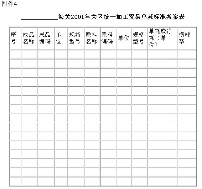4. 海关2001年关区统一加工贸易单耗标准备表