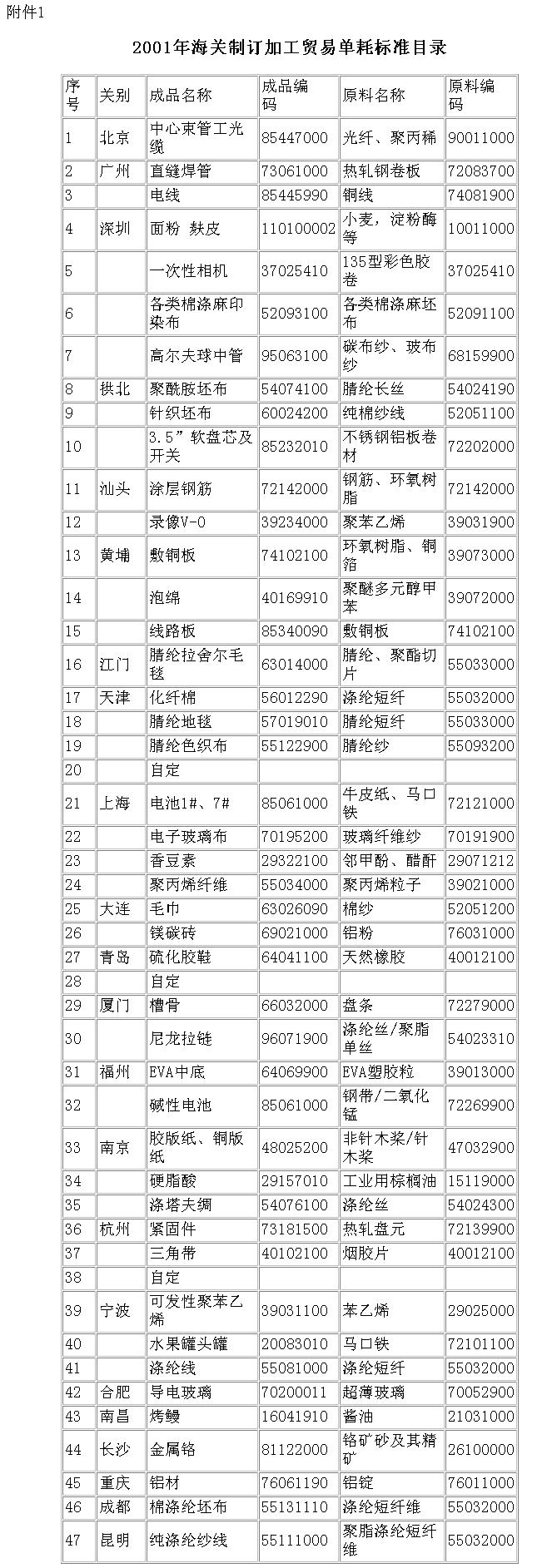 1.2001年海关制订加工贸易单耗标准目录