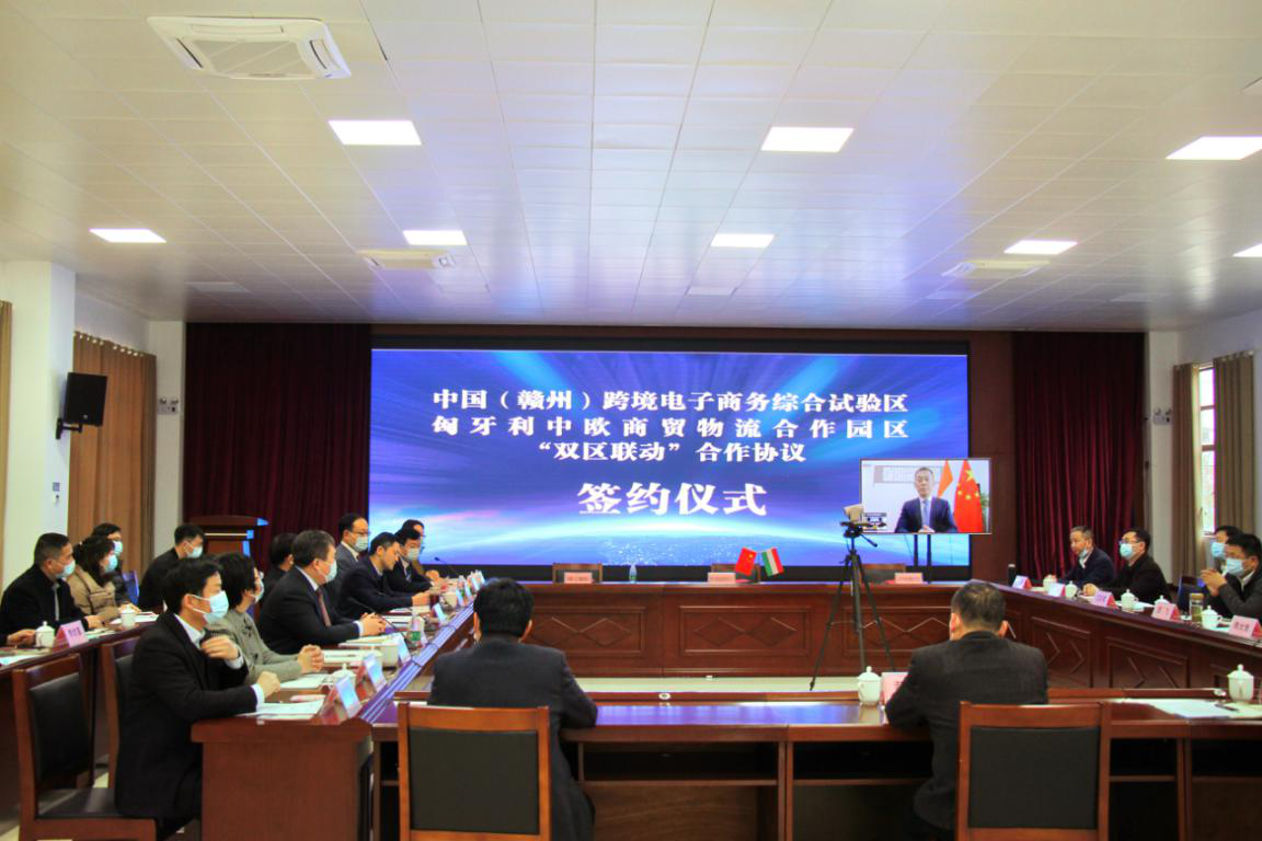 1月26日,中国(赣州)跨境电商综试区与匈牙利中欧商贸物流合作园区“双区联动”签约仪式在赣州成功举办。赣州国际陆港、匈牙利中欧商贸物流合作园区、阳光捷通(北京)贸易服务有限公司签署合作协议,三方将在中匈“双区联动”机制框架下,共同运行赣州至布达佩斯中欧班列跨境电商专列,打造跨境电商数字口岸和数字园区,建设数字供应链服务体系。匈牙利创新科技部国务秘书莫索奇·拉兹洛、驻匈使馆公使衔经济商务参赞刘波视频出席活动并致辞。