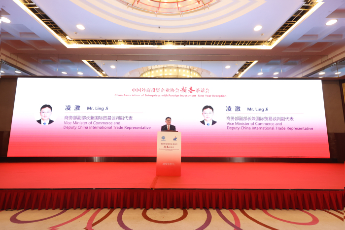 1月19日,中国外商投资企业协会新春茶话会在京举行,商务部副部长兼国际贸易谈判副代表凌激出席并致辞。新加坡驻华大使陈海泉、瑞典驻华大使欧思诚、瑞士驻华大使马婷、美中贸易全国委员会会长谭森、中国欧盟商会主席彦辞等外国驻华使领馆、外国商协会、跨国公司及中外投资促进机构300多位代表参加。