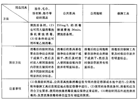 对供顾客使用的浴巾、毛巾、浴衣裤、垫巾等纺织用品、公共茶具、公用拖鞋、修脚工具应有严格的更换、洗涤、消毒、保洁制度,严格做到一客一换一消毒,其中对浴巾、毛巾、浴衣裤、垫巾等纺织用品和公共茶具应在洗涤消毒专间内洗涤消毒,对公用拖鞋和修脚工具应选择场所适宜地点进行洗涤消毒,经洗涤消毒后的各类用品用具应达到《公共场所用品卫生标准》的规定并保洁存放备用。各类用品用具更换、洗涤、消毒、保洁方法可采用附录1推荐的方法。