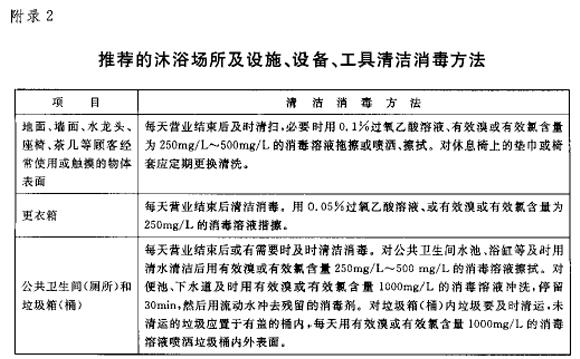 沐浴场所应及时清扫,对地面、墙面、水龙头、座椅、茶几等顾客经常使用或触摸的物体表面、更衣箱、公共卫生间(厕所)、垃圾箱(桶)、浴池、浴盆、洗脸盆、擦背凳及擦背工具、集中空调通风系统等宜按照附录2推荐的方法进行清洁消毒。
