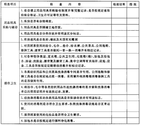 (三)建立自身检查与自检制度。对场所环境卫生状况、从业人员个人卫生、操作卫生等工作按照附录3进行每周一次检查并做好记录。对场所更衣室、浴室温度、照度、一氧化碳和二氧化堂浓度以及浴池水温度、浊度等进行每月一次自身检测并做好记录,对尚无能力开展自身检测的项目可委托有资质的单位进行检测。(自查自检项目和频次待沐浴协会提出)