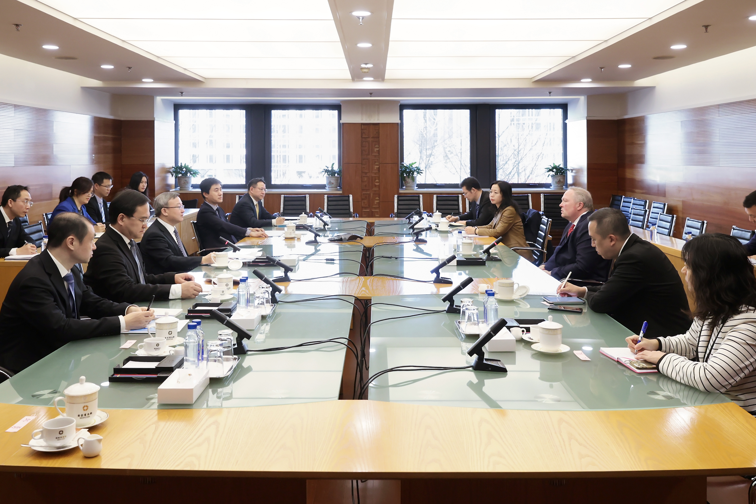 2月25日,王受文国际贸易谈判代表兼副部长会见宝洁公司全球董事长、总裁兼首席执行官詹慕仁,双方就中美经贸关系、宝洁在华发展等议题进行了交流。
