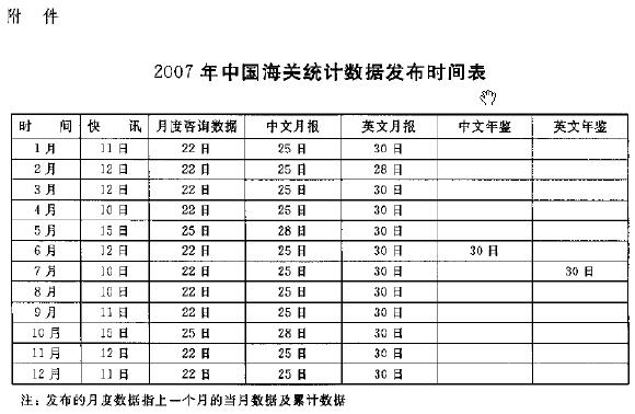 【发布单位】中华人民共和国海关总署 【发布文号】公告2006年第76号 【发布日期】2006-12-30 为加强海关统计的信息、咨询与服务工作,方便公众对海关统计数据的使用,根据《中华人民共和国海关统计条例》有关规定,现向社会公布《2007年中国海关统计数据发布时间表》,并就有关事宜公告如下: 一、中国海关统计是中国进出口货物贸易统计。统计数据的收集、整理编制和发布均由中国海关负责。中国海关采用国际通用的贸易统计标准,其数据具有全面性、可靠性和国际可比性。 二、2002年4月,我国正式加入由国际货币基金组织(IMF)建立并推行的“国际数据公布通用系统(General Data Dissemination System)”(以下简称GDDS)。作为中国对外贸易统计数据编制和发布的主管部门,我署按照GDDS的要求,就我国对外贸易统计数据的概念、数据质量、数据的完整性、公众对数据的可获得性及改进计划等方面作出解释并予以公布。公众可在我署政府网站及国际货币基金组织网站上查询有关详细内容。 三、我署已开通海关统计资讯网,为社会提供更便捷的海关统计咨询服务。 特此公告。 附件:2007年中国海关统计数据发布时间表 中华人民共和国海关总署 二○○六年十二月三十日 (稿件来源:海关总署提供)