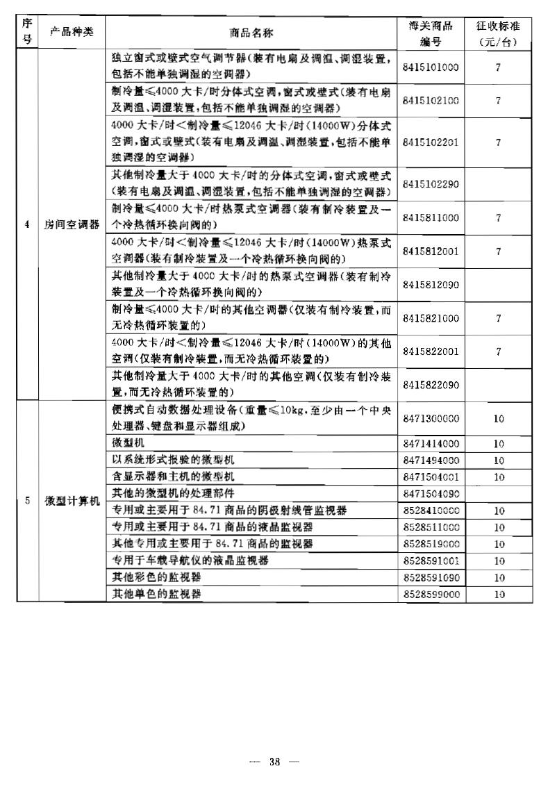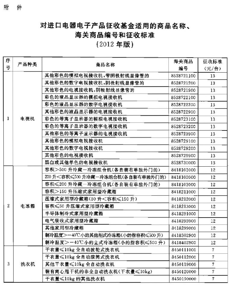 附件:对进口电器电子产品征收基金适用的商品名称、海关商品编号和征收标准