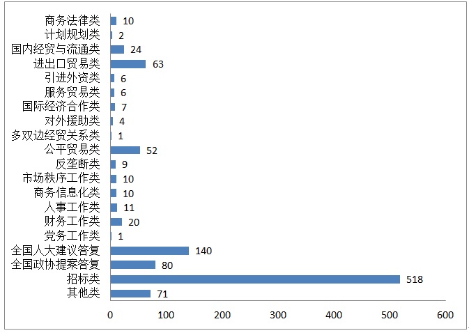2018年,商务部网站政府信息公开专栏主动公开信息1045条。其中,商务法律类信息10条,占公开信息总数的0.96%;计划规划类信息2条,占0.19%;国内经贸与流通类信息24条,占2.30%;进出口贸易类信息63条,占6.03%;服务贸易类信息6条,占0.57%;引进外资类信息6条,占0.57%;国际经济合作类信息7条,占0.67%;对外援助类信息4条,占0.38%;多双边经贸关系类信息1条,占0.10%;公平贸易类信息52条,占4.98%;反垄断工作类信息9条,占0.86%;市场秩序工作类信息10条,占0.96%;商务信息化类信息10条,占0.96%;人事工作类信息11条,占1.05%;财务工作类信息20条,占1.91%;党务工作类信息1条,占0.10%;全国人大建议答复140条,占13.40%;全国政协提案答复80条,占7.66%;招标类信息518条,占49.57%;其他类信息71条,占6.79%。2018年信息公开专栏访问量超过7356万人次。