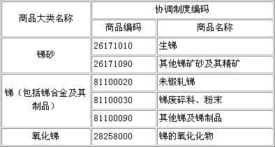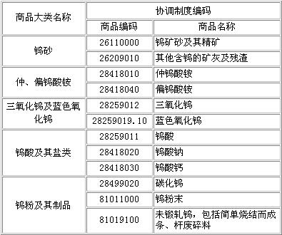 第二条 本办法所称钨及钨制品指钨砂,偏、仲钨酸钦,三氧化钨及蓝色氧化钨,钨酸及其盐类,钨粉及其制品,具体编码见附件1;锑及锑制品指锑砂,锑(包括锑合金)及其制品,氧化锑,具体编码见附件2。