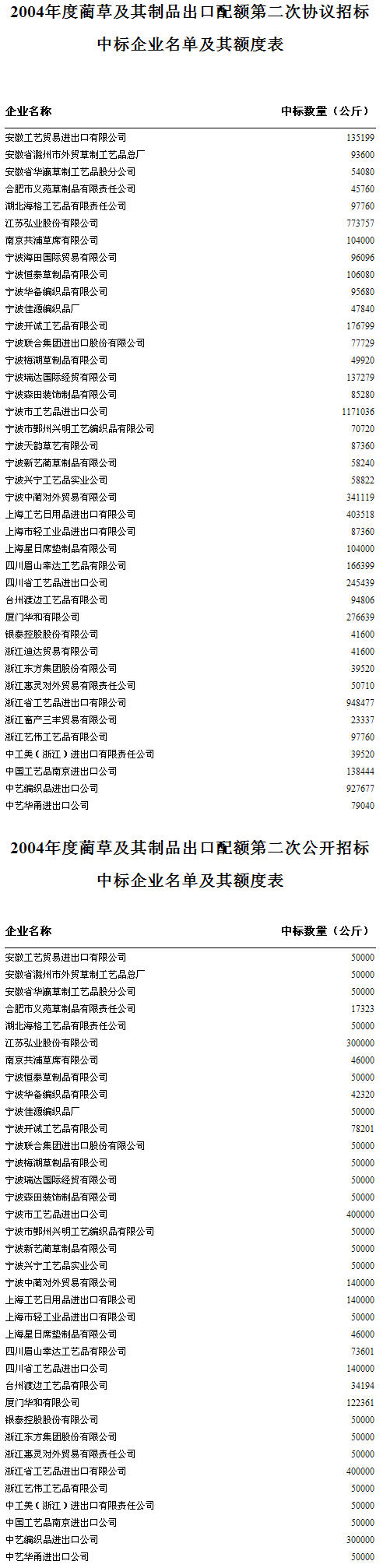 根据《出口商品配额招标办法》及《农产品出口配额招标实施细则》的规定,出口商品配额招标委员会对2004年度蔺草及其制品出口配额进行了第二次协议、公开招标。现将《2004年度蔺草及其制品出口配额第二次协议、公开招标中标企业名单及其额度表》(见附件)印发给你们。各中标企业凭商务部下达的中标企业中标数量和招标委员会下发的《申领配额招标商品出口许可证证明书》申领出口许可证。各有关发证机关严格按照有关规定核发出口许可证。