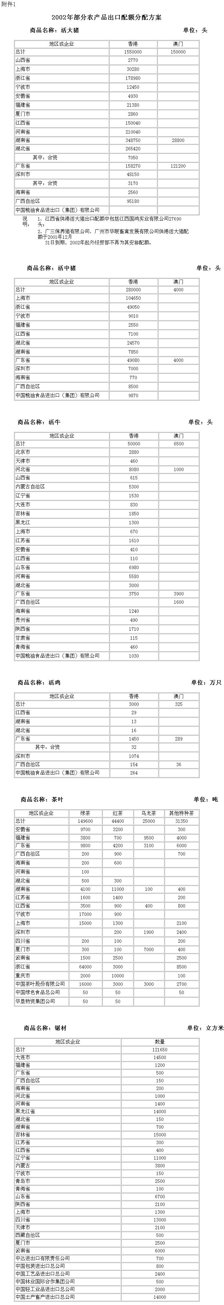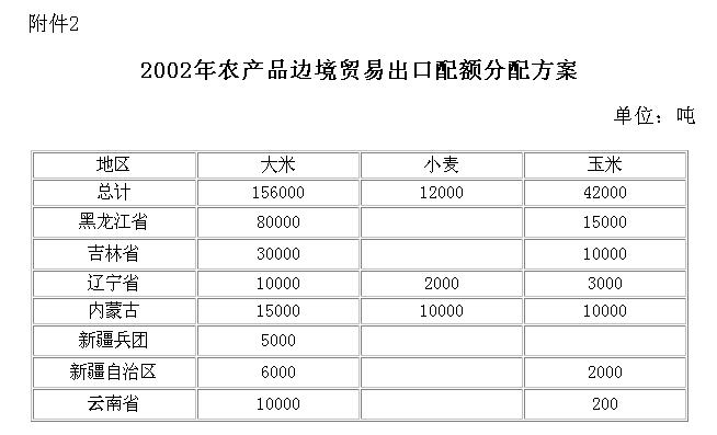 二、2002年部分农产品出口配额分配方案见附表1,2002年农产品边境贸易出口配额分配方案见附表2。