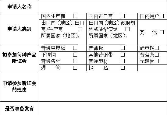 附件:申请参加部分钢铁产品保障措施调查听证会登记表