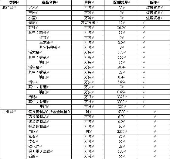 根据《中华人民共和国货物进出口管理条例》和《出口商品配额管理办法》,现公布2003年农产品、工业品和纺织品(被动配额除外)的出口配额总量。凡符合条件的配额申请人可按相关规定通过各省、自治区、直辖市及计划单列市外经贸委(厅、局)或直接向外经贸部提出申请。外经贸部受理申请的时间为2002年11月1日至11月15日。 附件:2003年农产品、工业品和纺织品(被动配额除外)出口配额总量 对外贸易经济合作部 二OO二年十月三十日 附件:2003年农产品、工业品和纺织品(被动配额除外)出口配额总量