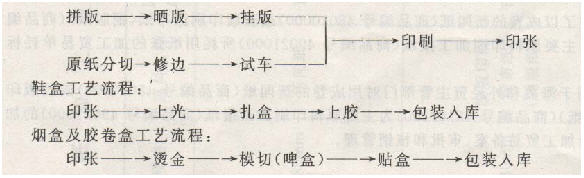 卷筒纸→切纸→印刷→烫金→模切(啤盒)→贴盒→成品