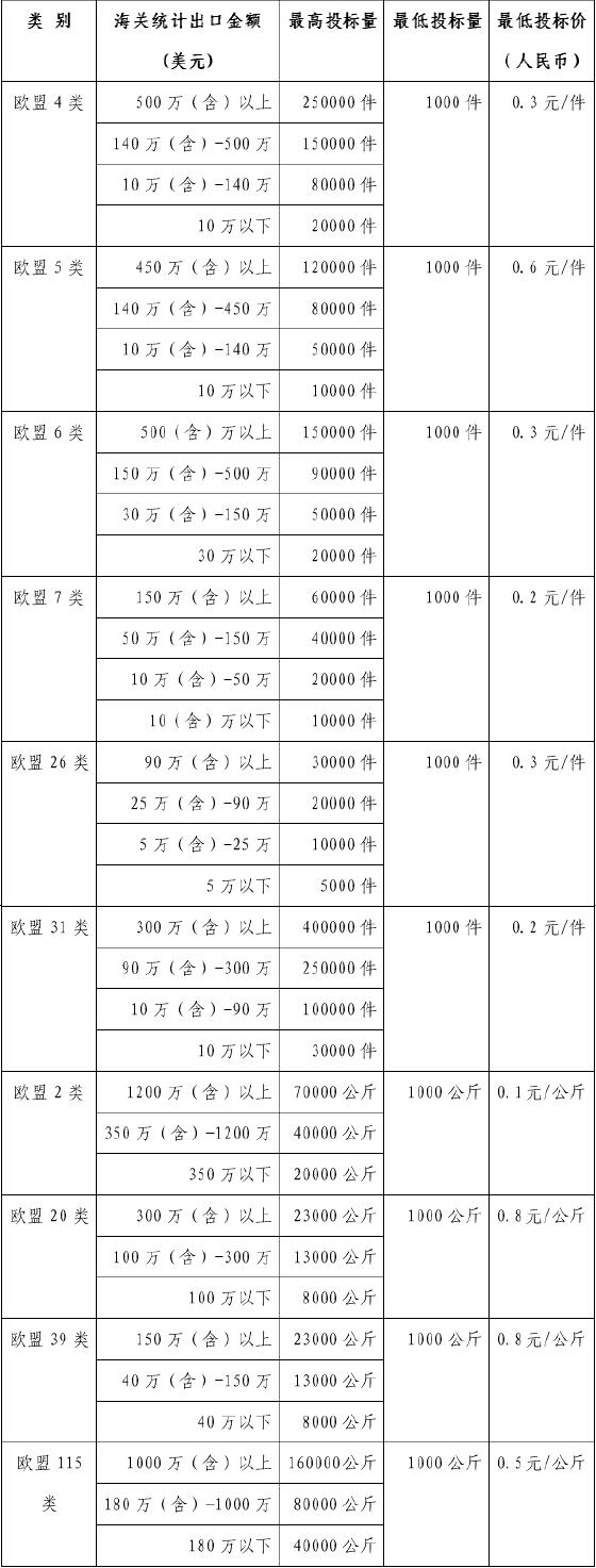 根据《细则》规定,招标委员会设定每个类别最低投标量和最低投标价格,并根据企业在2005年1-7月在所投标类别上对全球市场出口金额高低进行分档,设定相应的最高投标量,具体如下: