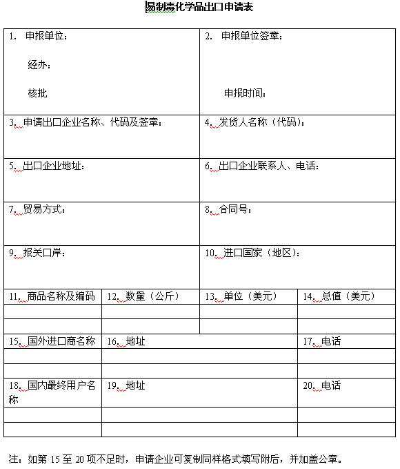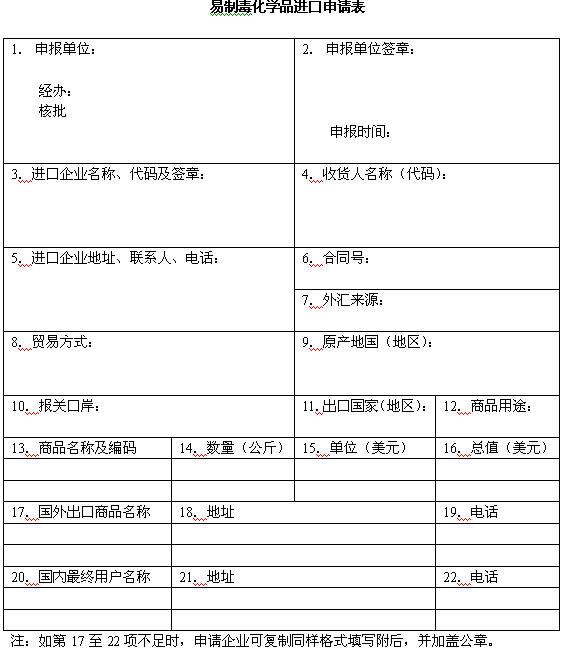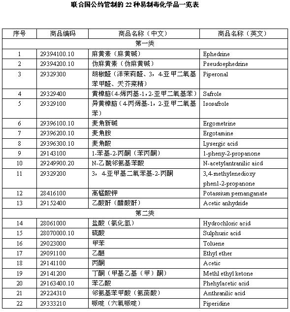 附件 易制毒化学品进出口管理规定第一章 总则 第一条 根据《中华人民共和国对外贸易法》、全国人民代表大会常务委员会《关于禁毒的决定》等有关法律,为加强对易制毒化学品进出口的管理,履行《1988年联合国禁止非法贩运麻醉药品和精神药物公约》(以下简称《公约》)的义务,特制定本规定。 第二条 本规定所称的易制毒化学品系指《公约》中列明的可用于制造、加工海洛因、甲基苯丙胺(冰毒)、可卡因等毒品的原料和化学配剂(详见附一)。 第三条 对外贸易经济合作部(以下简称"外经贸部")负责全国易制毒化学品的进出口管理工作,其管理工作接受国家禁毒委员会的指导与监督。 各省、自治区、直辖市及计划单列市外经贸委(厅、局)(以下简称"地方外经贸主管部门")负责本地区的易制毒化学品进出口管理工作,并接受外经贸部对其易制毒化学品进出口管理工作的监督与指导。 中央管理的企业负责本企业及下属进出口企业的易制毒化学品进出口管理工作,并接受外经贸部对其易制毒化学品进出口管理工作的监督与指导。 第四条 国家对易制毒化学品的进出口实行许可证管理。任何企业或单位无论以何种方式进出口易制毒化学品,均须报外经贸部批准。 第二章 进出口管理 第五条 国家对同制造、贩卖或贩运毒品严重的国家(地区)进行的易制毒化学品贸易实行严格管理,严禁进出口企业同制造、贩卖或贩运毒品严重、敏感国家(地区)的不法企业进行易制毒化学品贸易。 第六条 国家对重点监控的易制毒化学品的进出口实行核定企业经营。重点监控的商品目录及核定的企业名单经国家禁毒委员会批准后,由外经贸部公布执行。 第七条 凡从事易制毒化学品进出口业务的企业(以下简称"进出口企业")必须具有对外贸易经营权。 第八条 易制毒化学品进出口业务的检查 (一)凡经审批允许开展易制毒化学品贸易的进出口企业按业务归口管理的原则,应于每季度结束后10日内将上季度易制毒化学品的进口销售及使用情况,或出口及出运情况上报所在地外经贸主管部门或隶属的中央管理的企业。 (二)地方外经贸主管部门应督促进出口企业按时上报、定期检查进出口企业销售、使用易制毒化学品的情况,并在上一季度结束后一个月内将企业上报的情况和检查结果汇总报外经贸部。 中央管理的企业负责本企业及其下属的进出口企业按时上报、定期检查销售、使用易制毒化学品的情况,并在上一季度结束后一个月内将情况和检查结果汇总报外经贸部。 (三)外经贸部对地方外经贸主管部门和中央管理的企业易制毒化学品进出口的管理工作进行定期或不定期检查。 第九条 外商投资企业进出口易制毒化学品,按外经贸部颁布的《关于印发〈外商投资企业易制毒化学品进出口审批原则和审批程序〉的通知》([1997]外经贸资三函字第197号)的规定办理。 第三章 申请和审批程序 第十条 进出口企业进口或出口易制毒化学品,须按本规定申请。 (一)中央管理的企业进口或出口易制毒化学品向外经贸部提出申请。 (二)地方进出口企业或隶属中央管理的企业向其所在地外经贸主管部门或隶属的中央管理的企业提出申请,经其审核后报外经贸部批准。 第十一条 进出口企业在向地方外经贸主管部门或隶属的中央管理的企业申请时,以及中央管理的企业向外经贸部申请时须提交下列文件: (一)加盖进出口企业公章的《易制毒化学品进(出)口申请表》(见附二、附三,简称《申请表》)一式二份,一份由地方外经贸主管部门或中央管理的企业转报外经贸部,一份由地方外经贸主管部门或中央管理的企业留存。 (二)进出口企业资格证书(正本复印件)。 (三)一般贸易方式进(出)口易制毒化学品,提供进(出)口合同(正本复印件)。 (四)以加工贸易方式进口易制毒化学品,应提供加工贸易审批文件(正本复印件)和与外商签订的加工贸易合同(正本复印件)以及与国内加工生产企业签订的加工协议(正本复印件)。 (五)开展易制毒化学品贸易的出口企业在申请出口本规定附一所列的前11种易制毒化学品时,应提供最终用户国家(地区)政府主管部门签发的进口许可(正本复印件)或合法使用证明(正本复印件),若出口需经第三国(地区)转口,在提供上述文件和资料的同时,还须提供第三国(地区)政府主管部门出具的有效转口证明(正本复印件)。 (六)开展易制毒化学品贸易的进出口企业的上级行政主管部门为其下属企业进口易制毒化学品出具的保证书(正本)。保证书内容包括:进口企业和国内最终用户名称、通讯地址、联系电话及传真、进口商品名称、数量及用途、保证进口的易制毒化学品用于正常生产,不用于制造毒品或不流入非法制毒渠道,不再转口或复出口等等。 中央管理的企业为本企业或下属的进出口企业进口易制毒化学品出具的保证书(正本),有关内容同上。 开展易制毒化学品贸易的进口企业出具的保证书(正本),有关内容同上。 第十二条 地方外经贸主管部门或中央管理的企业对申请企业提交的文件进行审核后,向外经贸部上报经审批人签字、加盖公章的易制毒化学品进(出)口申请表,同时提供本规定第十一条所列的各项文件。 第十三条 外经贸部在收到符合审批条件的进(出)口申请后10个工作日内办理审批,并签发《对外贸易经济合作部易制毒化学品进(出)口批复单》(以下简称《批