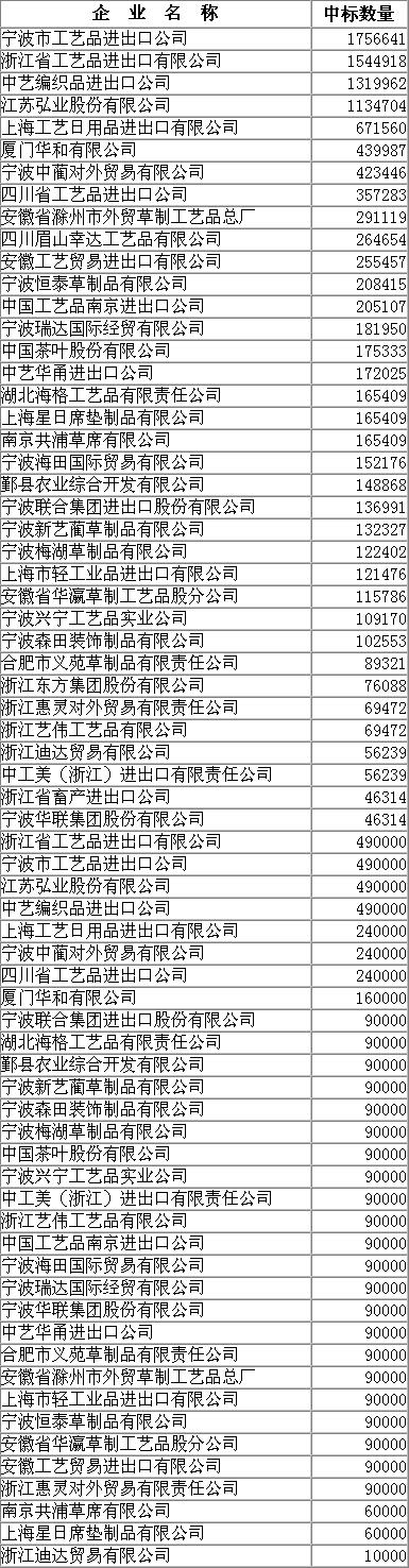 根据《出口商品配额招标办法》及农产品出口配额招标实施细则》的有关规定,出口商品配额招标委员会对2003年度 草及其制品(灯芯草属及其制品)出口配额第一次公开、协议招标。现将《2003年度蔺草及其制品(灯芯草属及其制品)出口配额第一次协议、公开招标中标企业名单及其额度表》(见附件)印发给你们。各中标企业凭外贸部下达的中标企业中标数量和招标委员会下发的《申领配额招标商品出口许可证证明书》申领出口许可证。请各发证机构严格按照有关规定核发出口许可证。