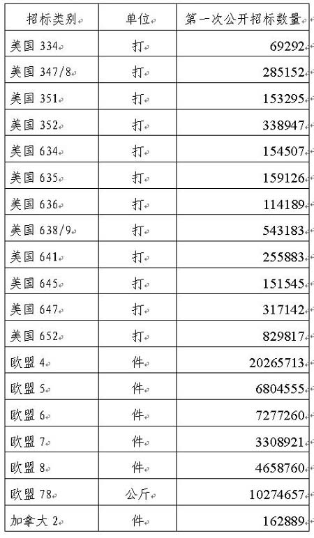 三、招标时间、数量比例 (一)协议招标: 招标时间:2003年9月22日至9月24日 截标时间:2003年9月24日21:00 开标时间:2003年9月25日9:30 协议招标一次招完,数量约为全部招标总量的70%。各企业各类别具体协议招标数量将在投标开始前在中国国际电子商务网(www.ec.com.cn)上的“中国纺配”“纺配协议招标程序”栏目中通知。 (二)公开招标:数量约为全部招标配额总量的30%,其中: 1、第一次公开招标: 招标时间:2003年9月23日至9月25日 截标时间:2003年9月25日21:00 开标时间:2003年9月26日9:30 本次招标量为公开招标总量的2/3,各类别具体招标数量如下: