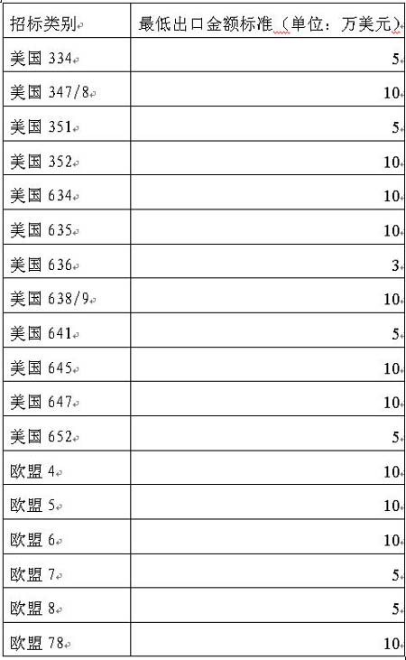 2、第二次公开招标:暂定为2004年3月上旬,具体时间将另行公告通知;招标量约为公开招标总量的1/3。其后视弃标配额数量、招标剩余配额数量、上交中标配额数量和与设限国交涉的配额调整数量等再行安排公开招标若干次,具体时间将另行公告通知。 四、投标资格: (一)公开招标 具备《细则》中规定的公开招标投标资格条件的出口企业,如出口企业某招标类别海关统计2002年7月至2003年6月对全球一般贸易100%和进料加工贸易30%的出口金额(本通知以下如无特殊说明,各类企业的出口业绩均以此为标准,并简称“海关统计出口金额”)能够达到一定标准,则获得该类别投标资格。具体投标资格最低“海关统计出口金额”标准如下: