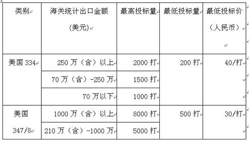 (二)协议招标 各类别协议招标资格标准如下: 1、对因在设限国设限前对该国有相应类别纺织品出口实绩而赋予其相应类别协议投标资格的出口企业,维持2003年协议招标配额类别和数量不变。 2、对按照出口业绩统计获得协议招标资格的自营出口生产企业,维持2003年协议招标配额类别和数量不变。 3、对2002年获得协议标新增部分数量的出口企业,维持相应协议招标配额类别和数量不变。 (三)在纺织品被动配额招标(包括公开、协议招标)中中标但未按规定交纳某些类别中标保证金而被取消投标资格的企业,及因某类别中标配额浪费率超过一定比例并通知被取消投标资格的企业不得参加该类别的投标(包括公开、协议投标)。对取消投标资格处罚期已满的企业恢复相应类别的公开招标投标资格,但协议标资格不予恢复。 五、投标方式: (一)公开招标: 利用“中国国际电子商务网”进行电子投标。企业在规定的截标时点前只能投一份电子标书,当同一企业成功送达的电子标书出现两份以上(含两份)时,该企业的投标视为无效。招标办公室不接受书面投标。已具有程序使用许可号和投标密钥的企业可继续使用,新取得公开招标投标资格的地方企业可于2003年9月23日前到所在地省级外经贸主管部门,中央管理企业可于9月23日前到纺配招标办公室接受投标培训、拷贝投标程序并抽报企业信息,申请取得程序使用许可号及投标密钥。 公开招标中各投标企业可通过投标程序查询本企业中标情况,企业中标与否以网上反馈的电子数据为准,招标办公室不再下发书面“中标通知书”。 (二)协议招标 纺织品配额招标办公室在中国国际电子商务网上的“中国纺配”“纺配协议招标程序”栏目中将各企业最高投标量分别下达给其所属省级外经贸主管部门,中央管理企业下达给纺配招标办公室。省级外经贸主管部门和纺配招标办公室通过使用密码可看到本口岸企业或各中央管理企业的最高投标数量、各类别投标价格,并负责将其通知相关企业。各投标企业在规定的投标数量内向当地外经贸主管部门进行分类别投标数量及投标价格的确认;各省级外经贸主管部门在规定的统一截标时间前将企业分类别确认的协议招标投标数量及投标价格通过“中国国际电子商务网”报纺织品配额招标办公室。中央管理企业的通知和确认工作由纺织品配额招标办公室直接负责。 六、最高、最低投标量,最低投标价格 (一)公开招标 招标委员会根据企业“海关统计出口金额”进行分档,企业每次公开招标最高投标量如下: