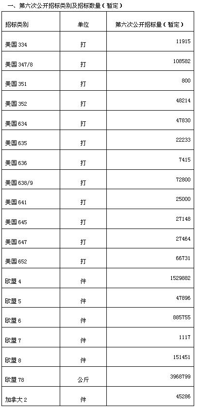 注:为不浪费配额,招标委员会决定将企业上交的配额也纳入本次招标。因企业上交配额截止时间为12月8日17:00,本公告公布的招标数量为暂定数量,各类别招标数量会根据企业上交情况有所调整。 二、标时间:2004年12月7日- 12月8日 截标时间:12月8日 21:00 开标时间:12月9日 9:30 三、其他事项按照《2004年度纺织品被动配额招标公告》有关规定执行。 四、本次公开招标将于2004年12月9日开标,当日公布初步结果,投标企业如有疑问,可于12月9日15:00之前向招标办公室提出。12月9日17:00前,招标委员会公布正式中标结果。企业中标与否以网上反馈的电子数据为准,招标办公室不再下发书面“中标通知书”。 五、中标企业须于2004年12月13日前将所有中标配额的100%中标金交至以下指定银行账号: 开户行:中信实业银行北京东单支行 户 名:中国纺织品进出口商会 账 号:7112410182600001557 六、电子招标投标技术保障工作由中国国际电子商务中心(EDI)负责,具体操作上的问题由其负责解答。 电话:010-67870108 传真:010-67800343 请各投标企业检查投标软件,在规定时间内投标。对于不能按时传送电子标书的企业,按招标办法规定,招标委员会不接受任何时间、任何形式的书面标书(包括传真、快件等)。 七、纺织品被动配额招标办公室地址:北京市朝阳区潘家园南里12号楼7层(中国纺织品进出口商会) 电话:010-67739327,67739208 传真:010-67719297 八、其他事项根据《出口商品配额招标办法》、《纺织品被动配额招标实施细则》及《2004年度纺织品被动配额招标公告》有关规定执行。