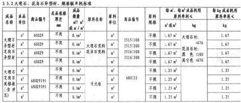 石材产品单耗:指在正常生产条件下,加工每单位重量(kg)板材或异型材所耗用的原料重量(kg)或加工1㎡板材或1m3异型材所耗用的原料体积(m3)。(包括工艺损耗)
