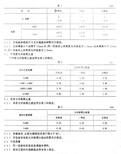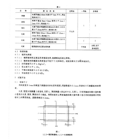 按板材的规格尺寸允许偏差、平面度允许极限公差,角度允许极限公差、外观质量、镜面光泽度分为优等品(A)、一等品(B)、合格品(C)三个等级。