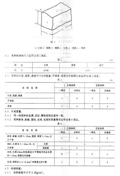 本标准对原料(大理石荒料、花岗石荒料)品质要求应符合国家、行业现行标准(JC202--92,JC204--92)及合同对原料品质的认定。