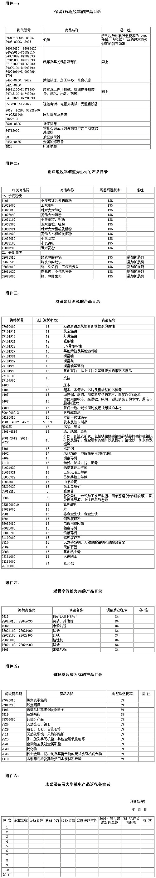 五、 出口企业在2003年10月15日前已对外签订的、价格不可更改的属于本通知第四条第(四)款范围的成套设备(指出口价值在200万美元以上的成套设备)及大型机电产品(指单台、件价值在100万美元以上的机电产品)的出口合同,按合同规定的出口日期在2004年1月1日以后出口的,必须在2003年11月15日前执出口合同正本和副本到主管退税机关登记备案,省国家税务局审核后,在2003年11月30日前将符合条件的出口合同及有关资料报国家税务总局(上报格式见附件六),国家税务总局会同财政部审核批准后,由当地国家税务局按调整前的退税率办理退税。对未能在2003年11月15日前登记备案的成套设备和大型机电产品,一律按调整后的退税率办理出口退税。
