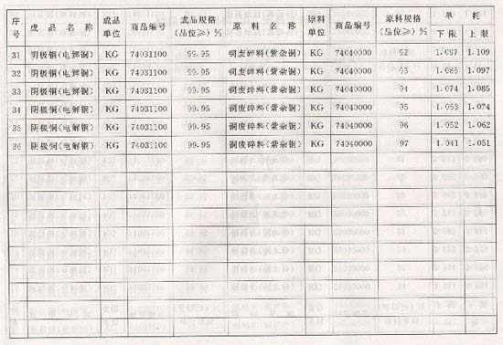 单耗指在正常生产条件下,生产某一质量单位的阴极铜所耗用的铜精矿(铜矿砂)的质量单位数、耗用未精炼铜(粗铜)、电解用铜阳极的质量单位数或耗用铜废碎料(紫杂铜)的质量单位数,包括加工过程中的工艺损耗。单耗标准是上下限。