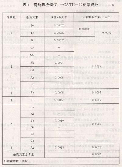 铜精矿由电解精炼法或电解沉积法生产得到阴极铜。按国标GB/T 467-1997《阴极铜》的规定,阴极铜按化学成分分为高纯阴极铜(Cu-CATH-1)和标准阴极铜(Cu-CATH-2)和两个牌号,见表4、表5:
