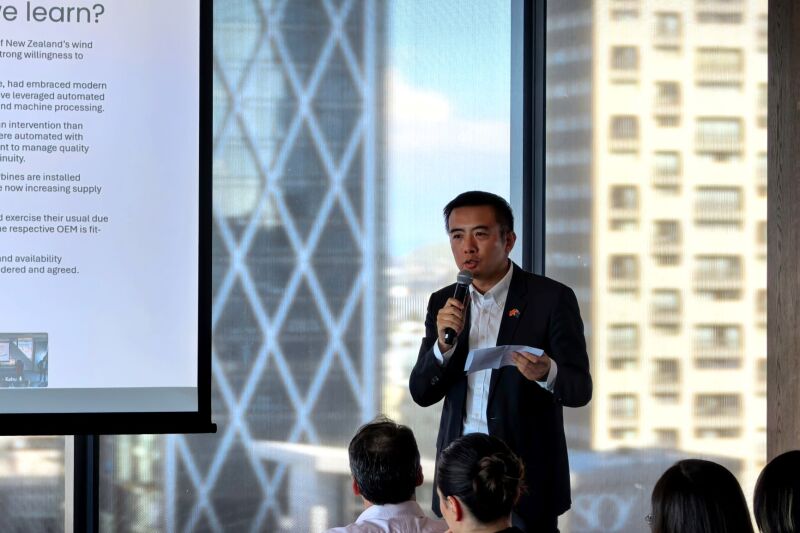 驻奥克兰总领馆经商处主任王程光领事应邀参会,并在互动环节介绍中国2035年国家自主贡献目标和“十五五”风电发展规划情况。王程光表示,新西兰风力资源丰富,已设定风电装机雄心目标;中国风电企业凭借高效、创新和可靠的产品赢得全球市场;双方在风电领域开展合作,有助于共同应对气候变化挑战。