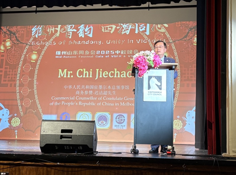 10月5日,我馆负责经商事务的参赞衔领事迟洁超出席维州山东同乡会“维州鲁韵,四海同心”中秋庆祝活动并致辞。迟参首先向各位山东同乡以及在座政商界代表致以节日问候。他指出,山东人诚信豪爽、热情好客,山东同乡会在推动中澳经贸交流、弘扬中华传统文化等方面做了大量卓有成效的工作。山东和维州在经贸、教育、旅游、科技创新等领域合作潜力巨大,希望山东同乡会继续发挥桥梁纽带作用,为维州新的中国战略的实施和中澳各领域务实合作作出更大贡献。