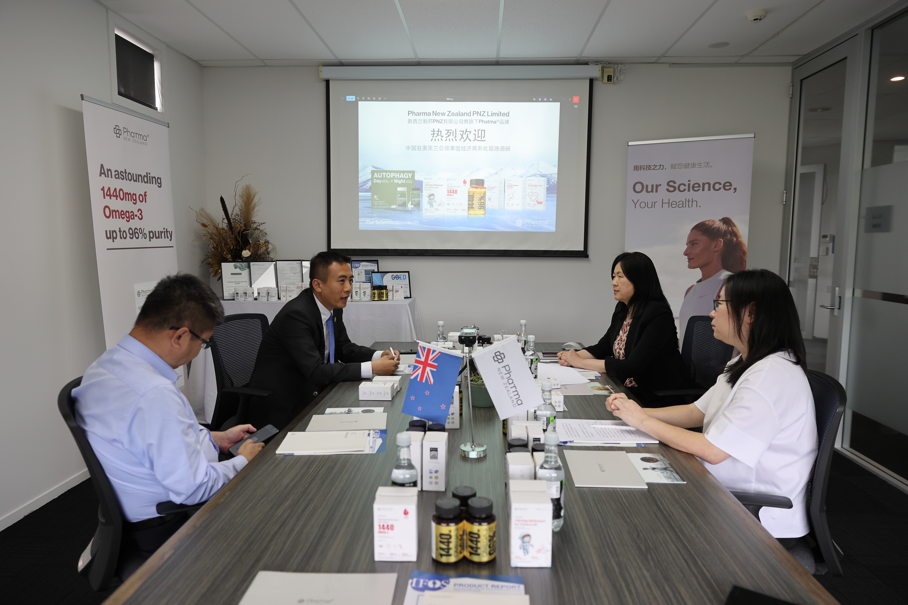 10月30日,驻奥克兰总领馆经商处主任王程光领事、果鹏文领事参访新西兰制药PNZ公司,与出口经理李颐、财务总监孙丹交流。