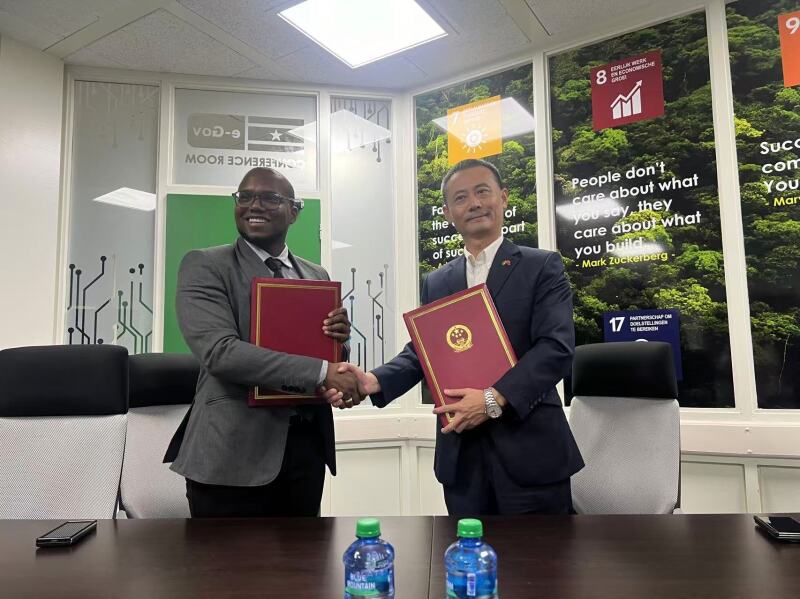 4月24日,驻苏里南使馆贾金易参赞与苏里南政府电子政务局局长Ilydion Dalfour先生共同签署援苏道路监控项目移交文本。