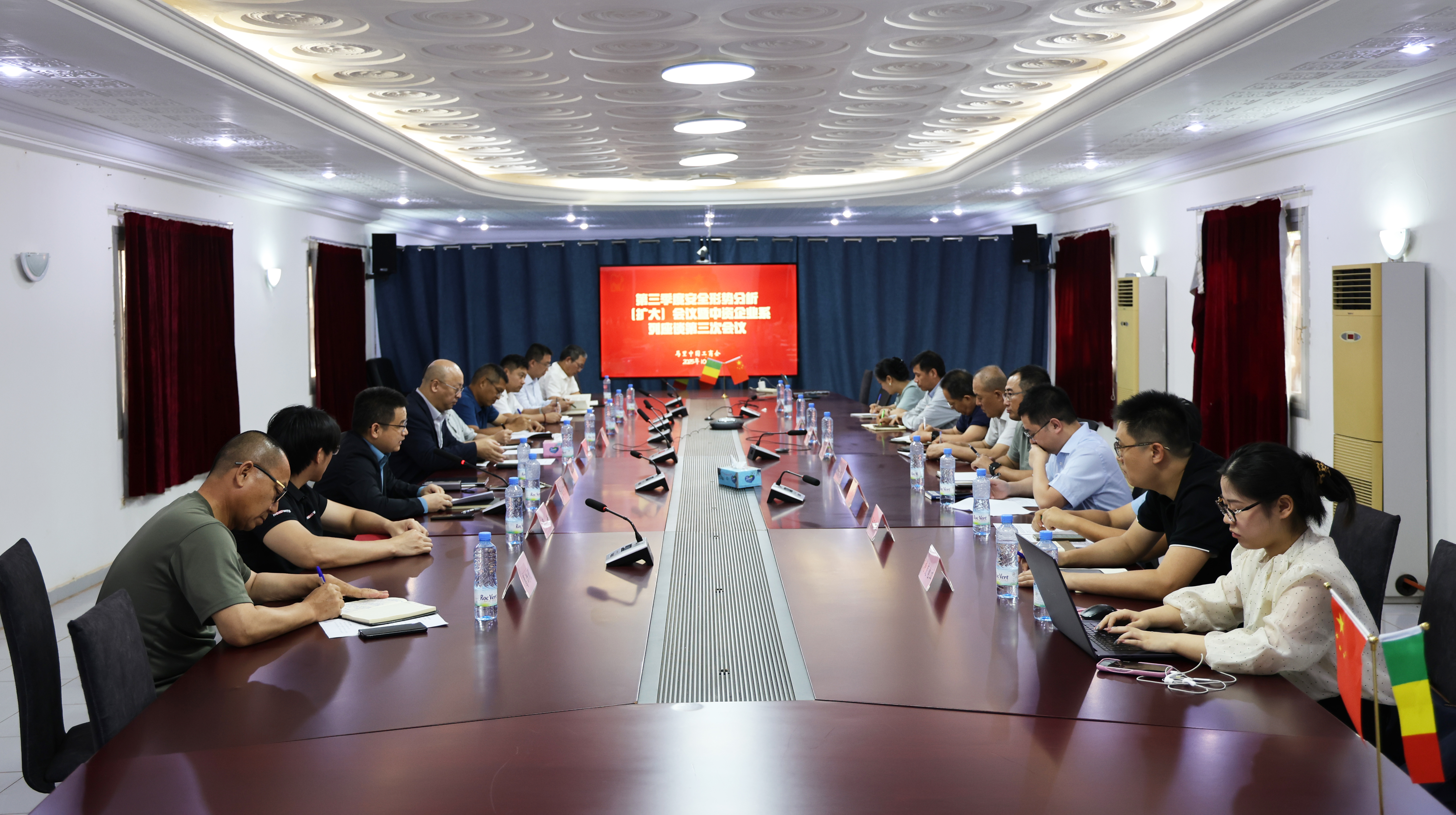 10月31日,马里中国工商会在中海外驻地召开第三季度安全形势分析(扩大)会暨中资企业座谈会,于维华参赞出席并讲话。在马15家企业代表20余人参加座谈并深入交流。经商处随员李欣陪同。