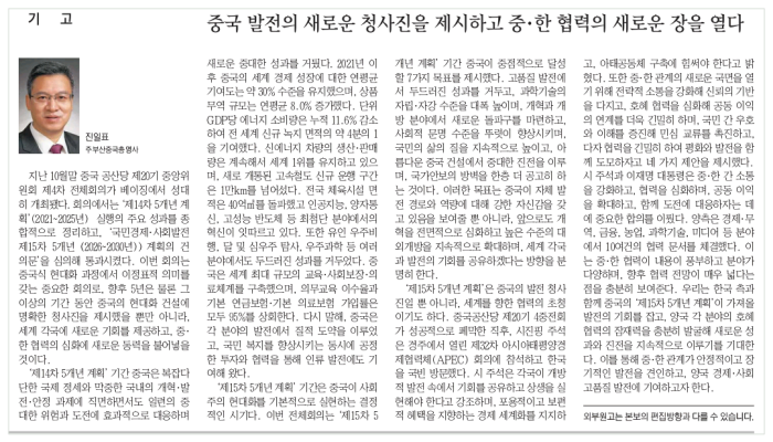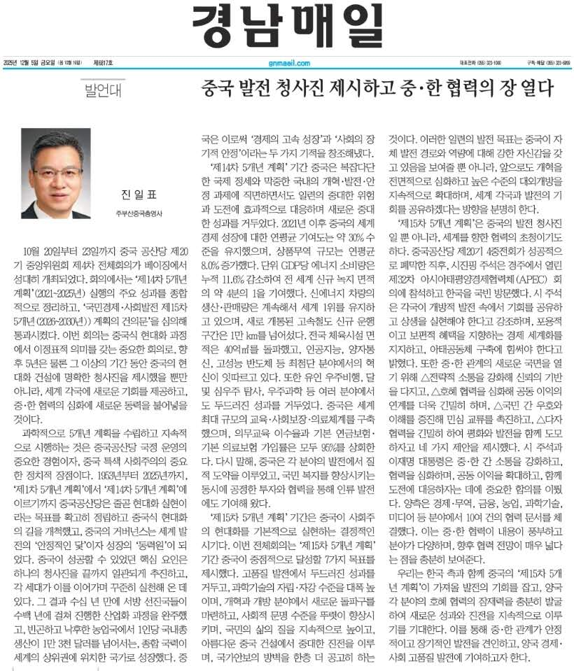 近日,驻釜山总领事陈日彪在领区媒体《庆南每日》《庆尚日报》发表署名文章《擘画中国发展新蓝图 共谱中韩合作新篇章》,向领区各界宣介中国共产党二十届四中全会精神,重点介绍“十四五”时期社会发展成就和“十五五”规划主要目标举措,强调中国成功的密码就是坚持一张蓝图绘到底,一茬接着一茬干。期待中韩共同抓住“十五五”规划带来的共赢机遇,加强互利合作,推动中韩关系行稳致远。